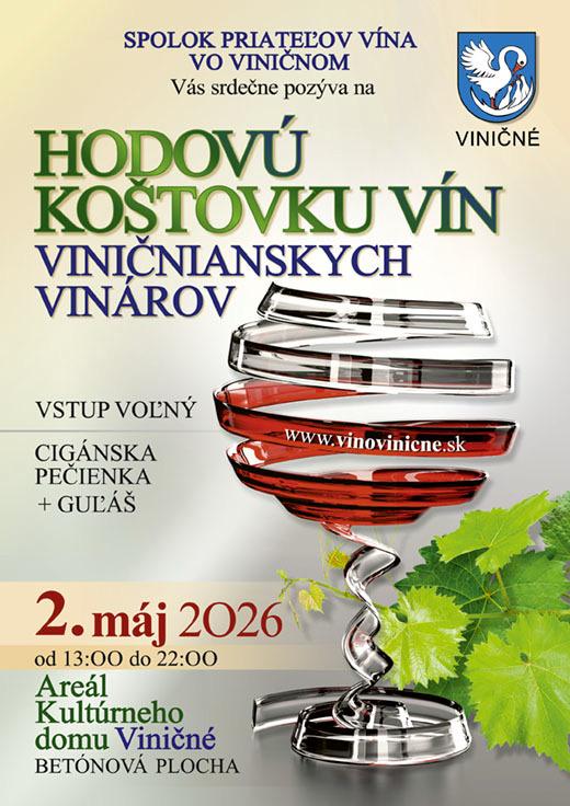 pozývame vás na 3. ročník Hodovej koštovky vína Viničnianskych vinárov, ktorý sa uskutoční v sobotu 2. mája 2026 v čase od 13:00 do 22:00 hod. na betónovej ploche Spoločenského domu vo Viničnom.